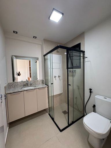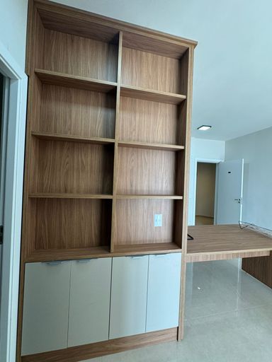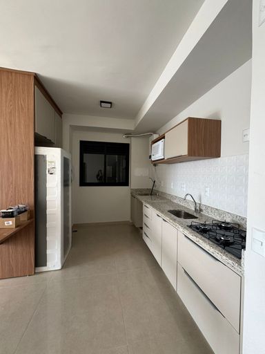 Contém 1 dormitório planejado, com guarda roupa e cama de casal, sala com painel de TV, cozinha planejada com armários, fogão cooktop, geladeira, microondas, banheiro social com box e armário planejado, vista privilegiada. Apartamento com acabamento incrível, piso porcelanato e laminado.