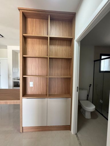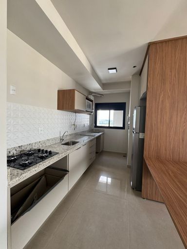 Contém 1 dormitório planejado, com guarda roupa e cama de casal, sala com painel de TV, cozinha planejada com armários, fogão cooktop, geladeira, microondas, banheiro social com box e armário planejado, vista privilegiada. Apartamento com acabamento incrível, piso porcelanato e laminado.